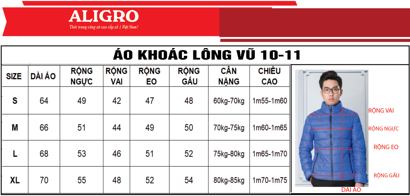 Áo khoác lông vũ Aligro ALGALV.9 màu anh navy được may từ chất liệu vải Polyester cao cấp, nhẹ và ấm, mang đến cho phái mạnh sự thoải mái tối đa, kiểu dáng trần ngang khỏe khoắn nam tính.