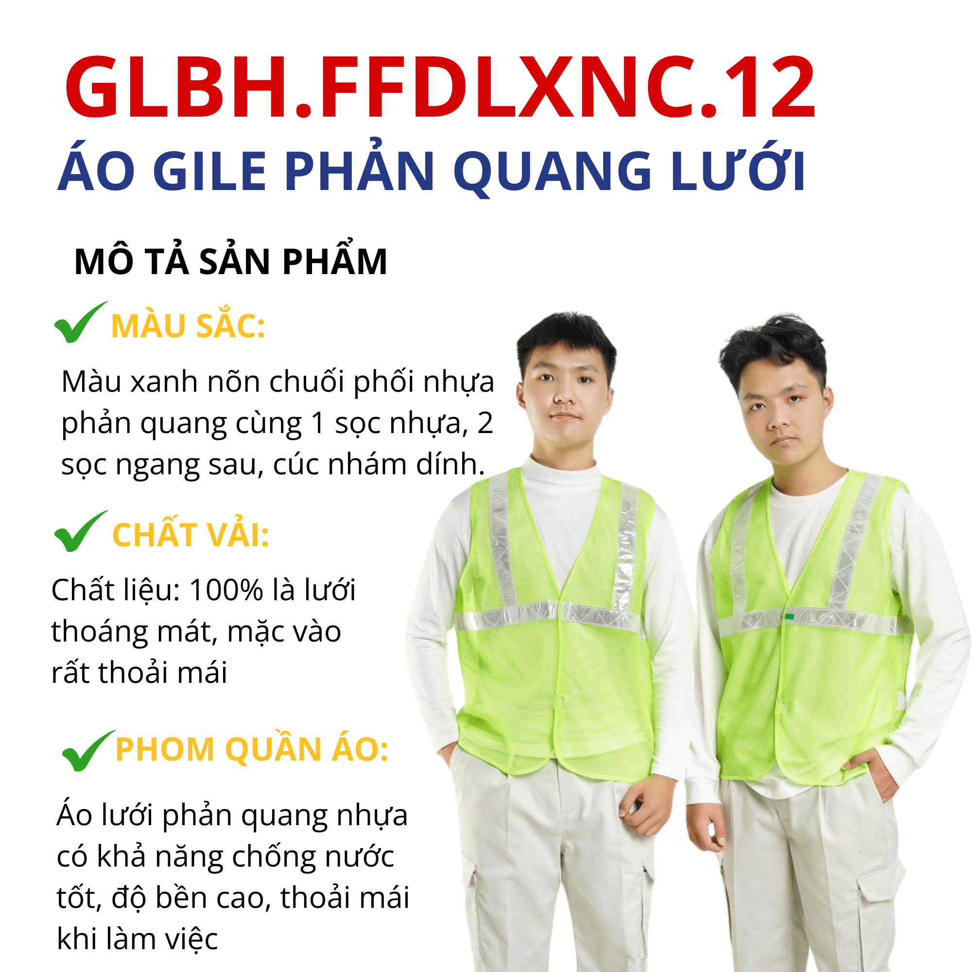 Áo gile bảo hộ lao động lưới phản quan nhựa màu xannh nõn chuối GLBH.FFDLXNC.12 là áo bảo hộ lao động được thiết kế dành riêng cho công nhân, kỹ sư, mang đến sự thoải mái và an toàn tối đa trong quá trình làm việc. Sản phẩm được may từ vải lưới thoáng mát, trước và sau may thêm sợi phản quang màu ghi phù hợp với công nhân làm việc trong môi trường có ánh sáng yếu.