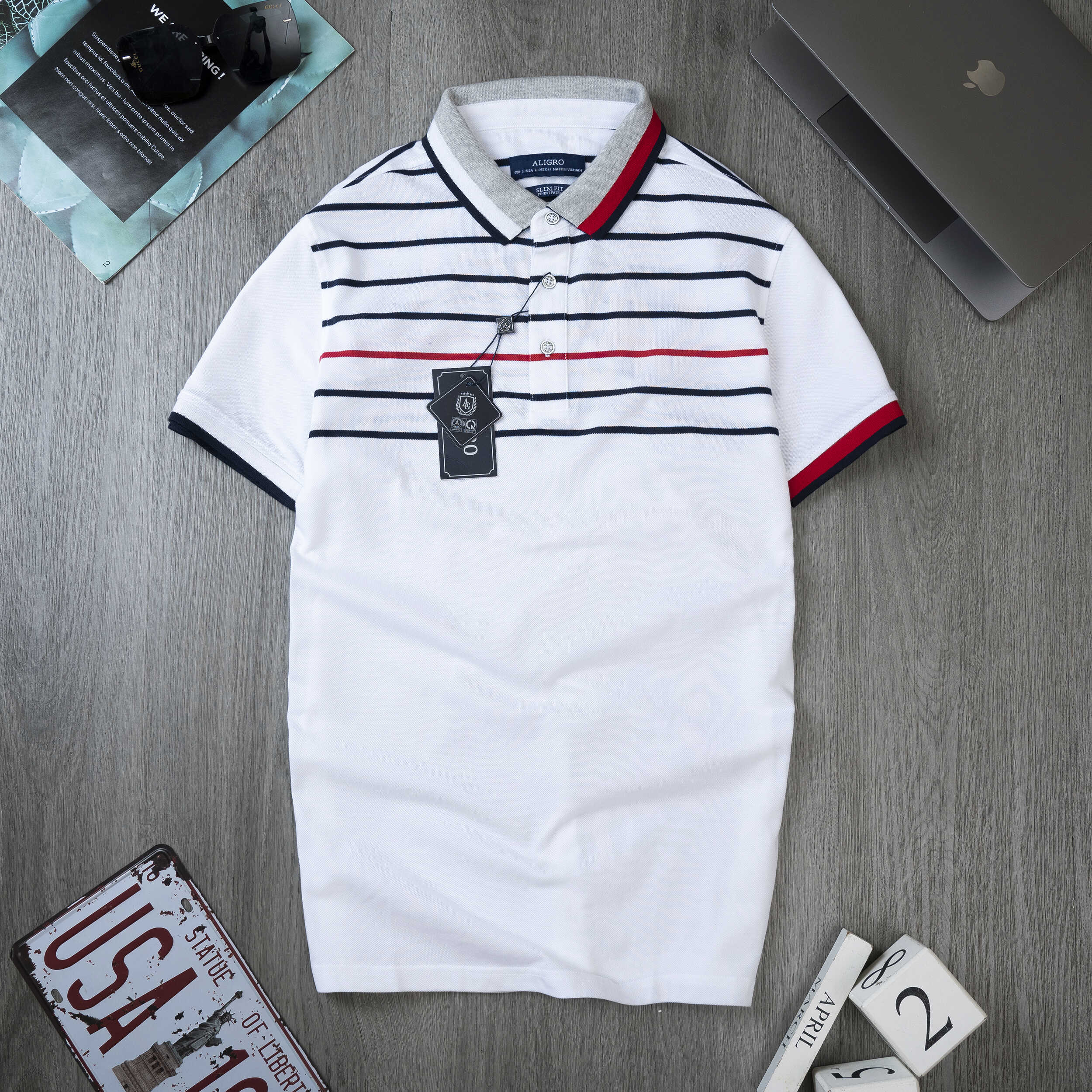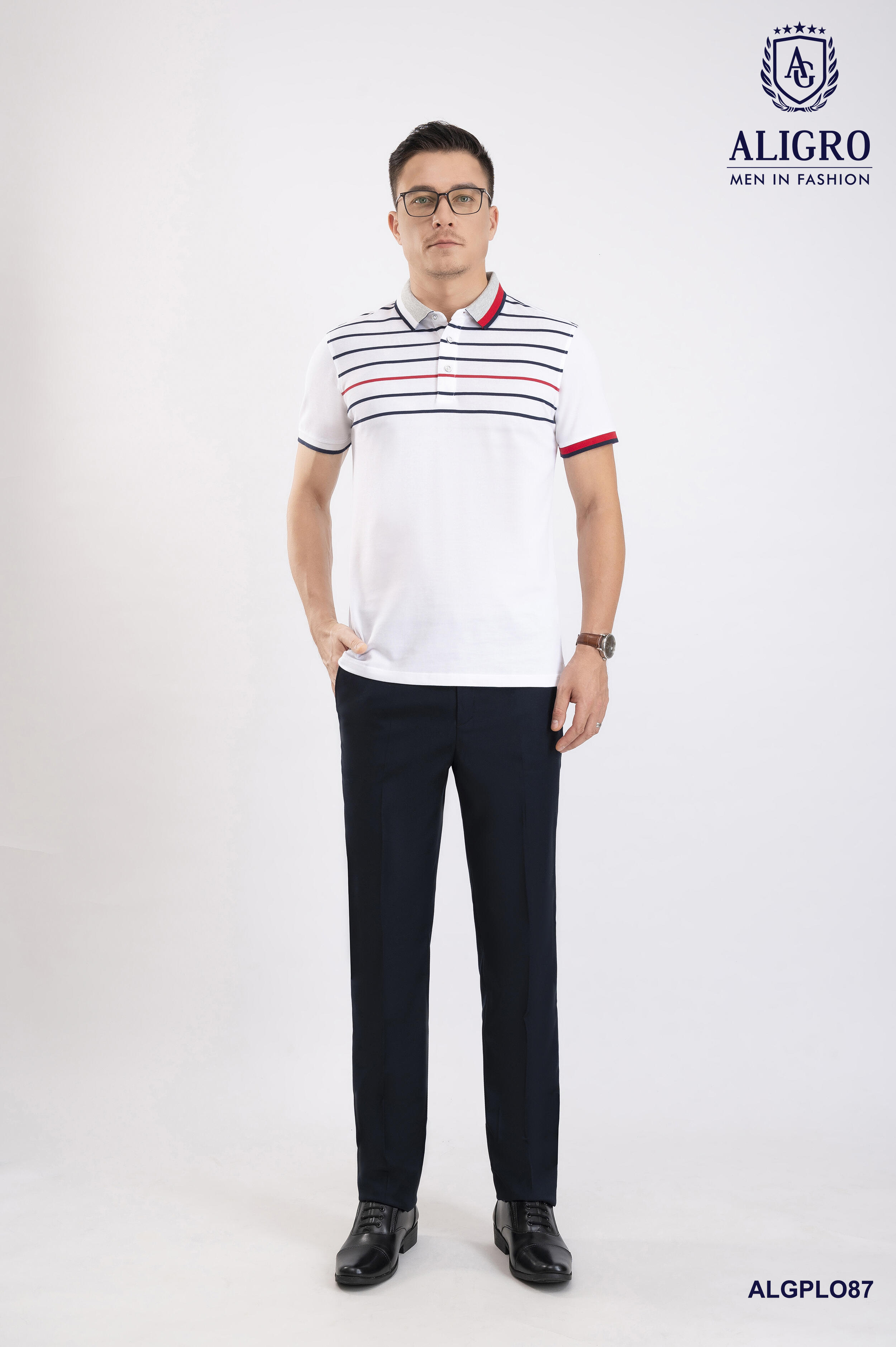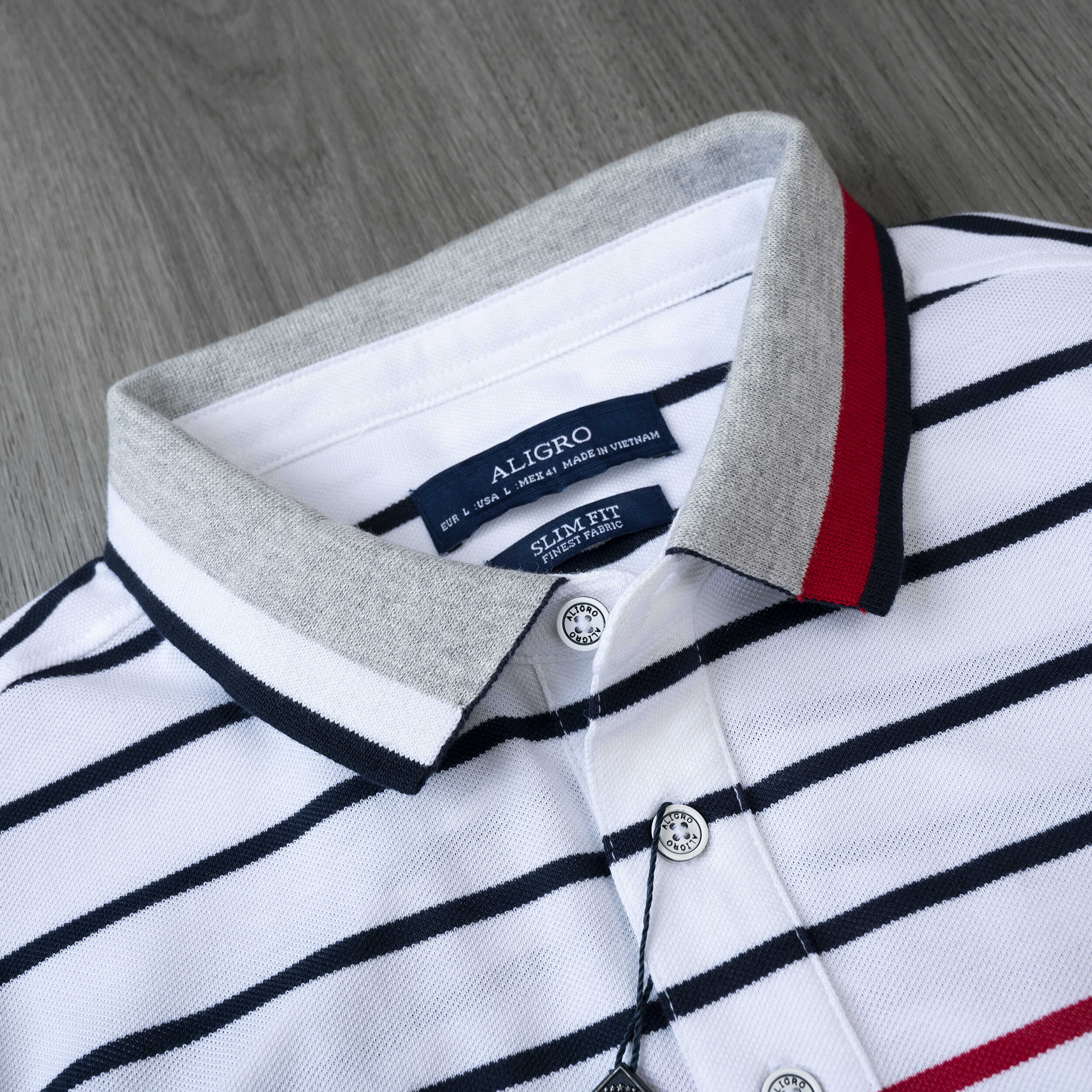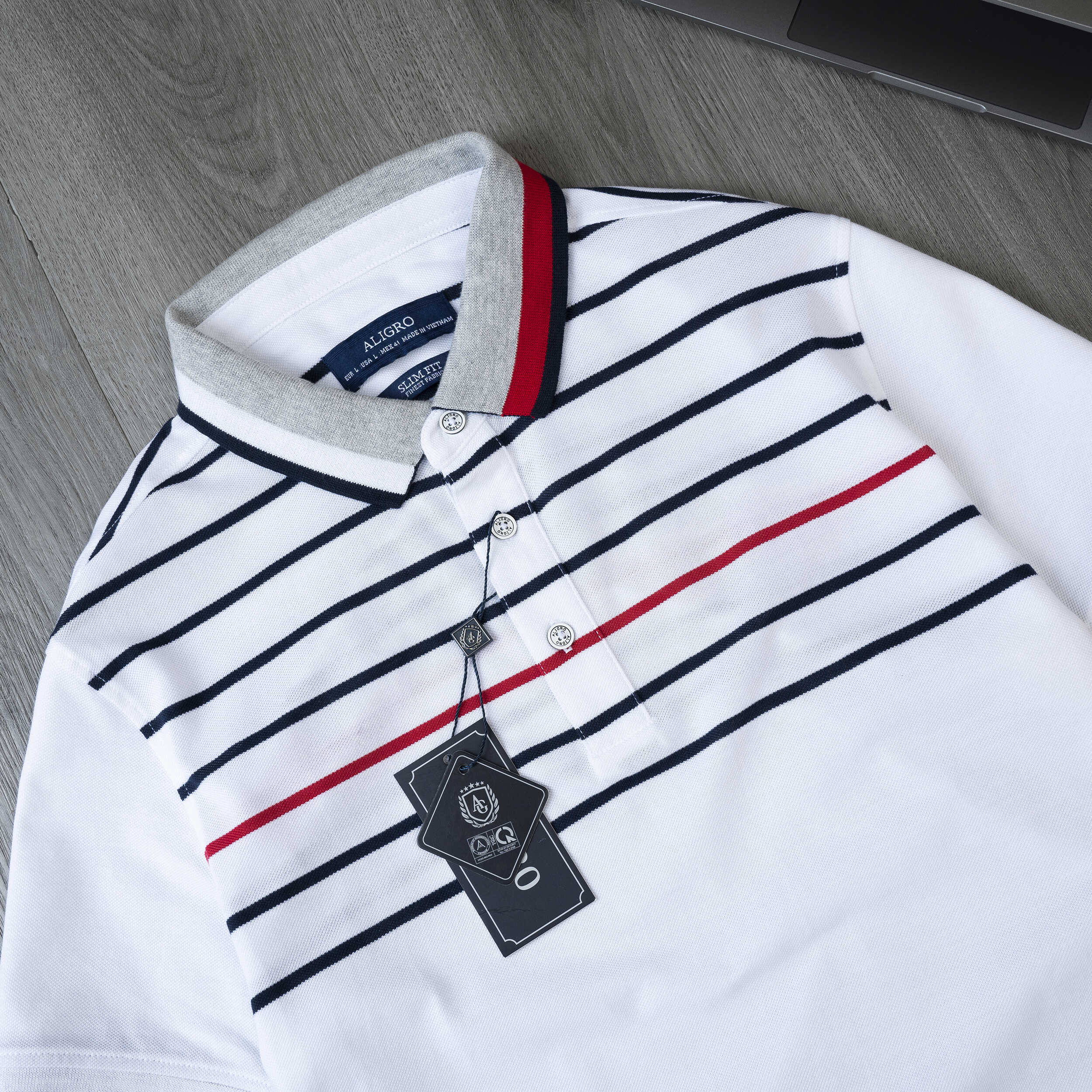 Áo polo nam ngắn tay cao cấp Aligro ALGPLO87 chất liệu 100% cotton form SLIMFIT kẻ ngang trắng-đỏ-đen