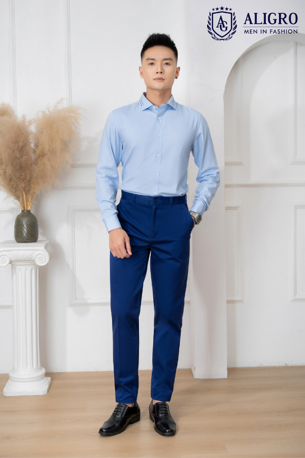 Áo sơ mi nam dài tay cao cấp Aligro ALGS214 chất liệu vải BAMBOO form SLIMFIT màu xanh dọc chìm