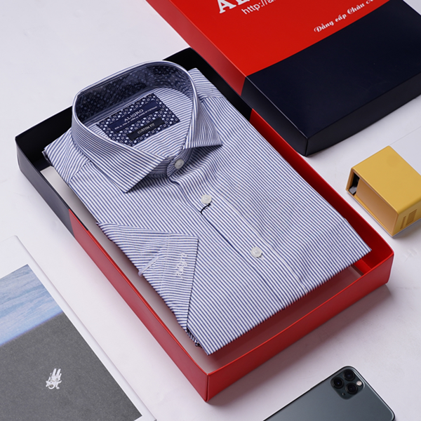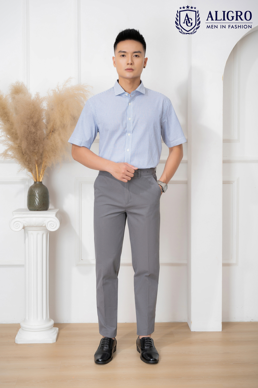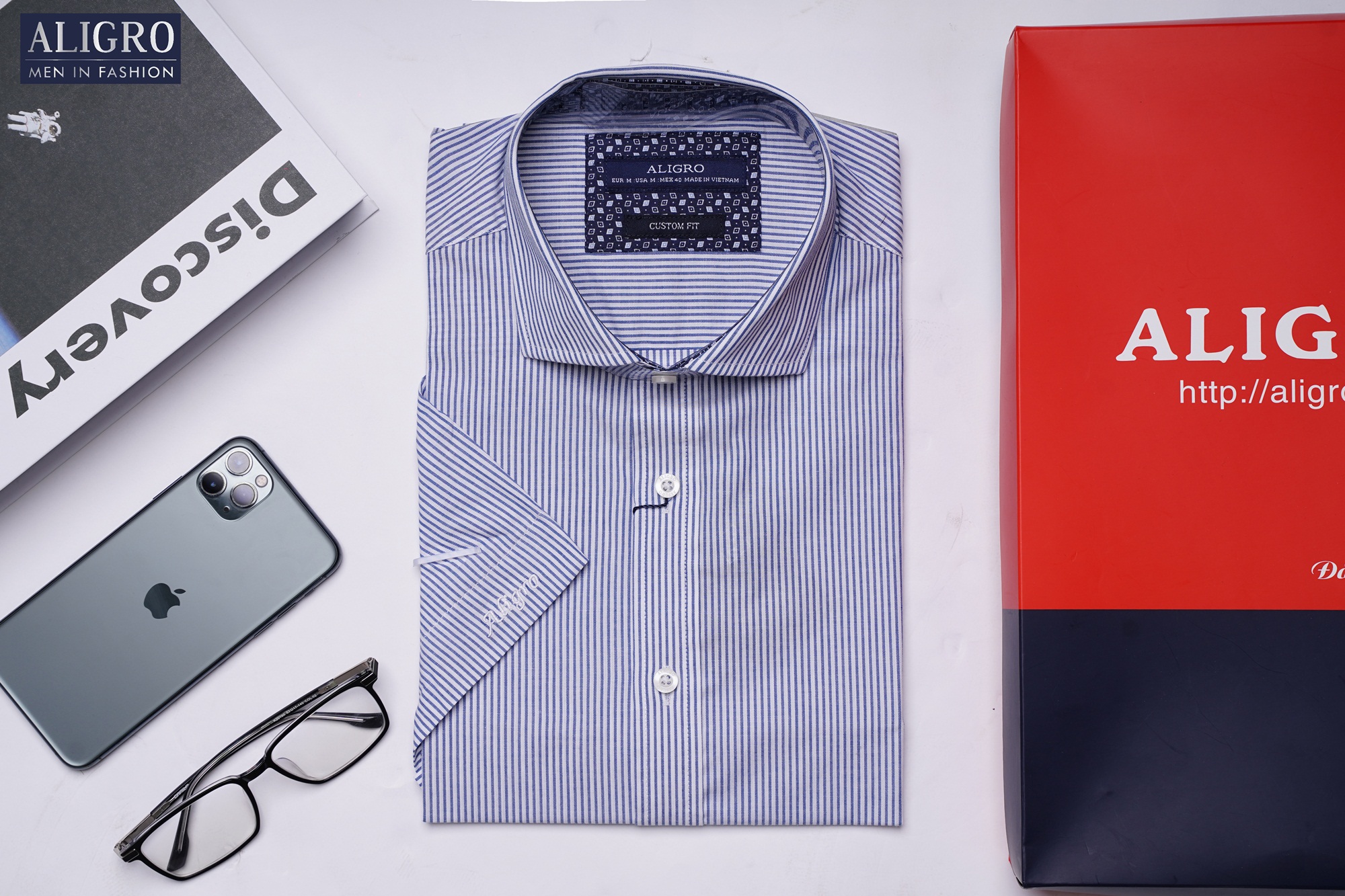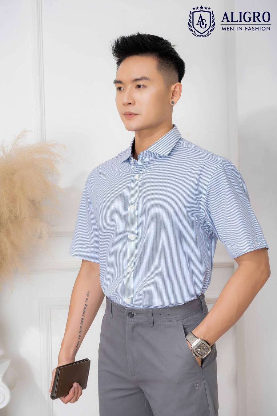 Áo sơ mi nam ngắn tay cao cấp Aligro ALGS-C82 vải cotton linen form Customfit kẻ sọc xanh