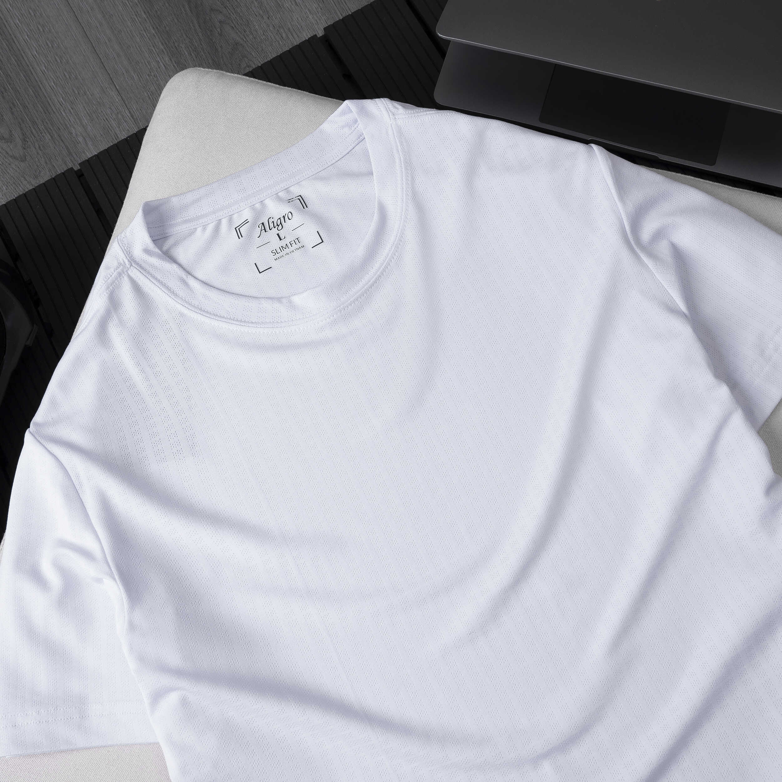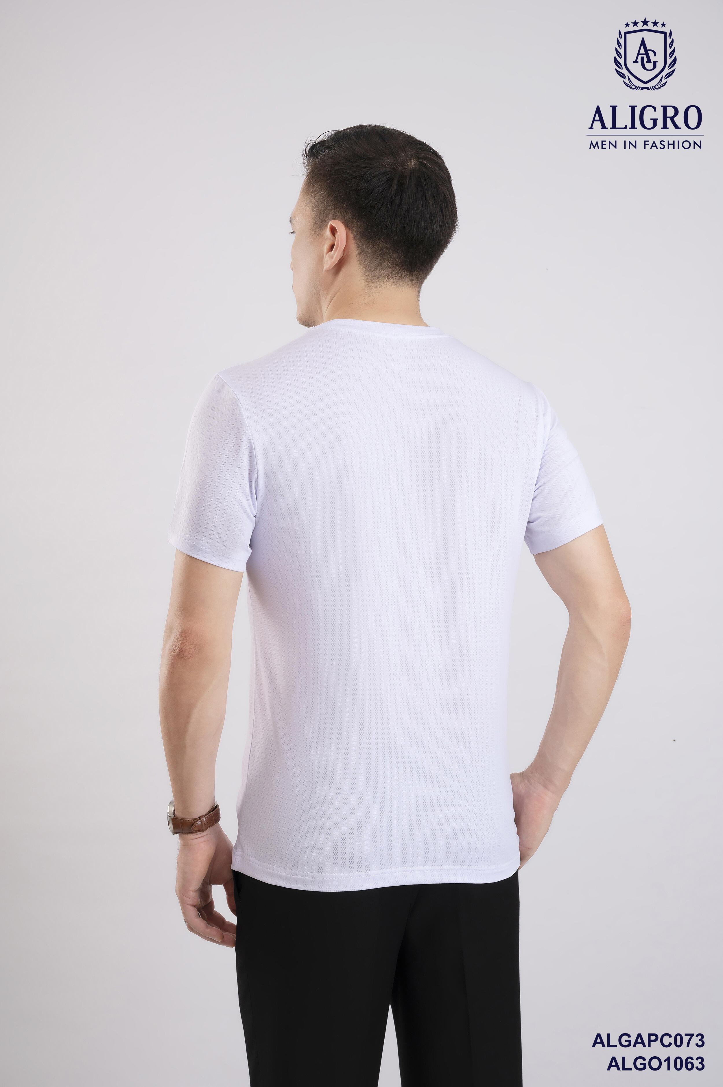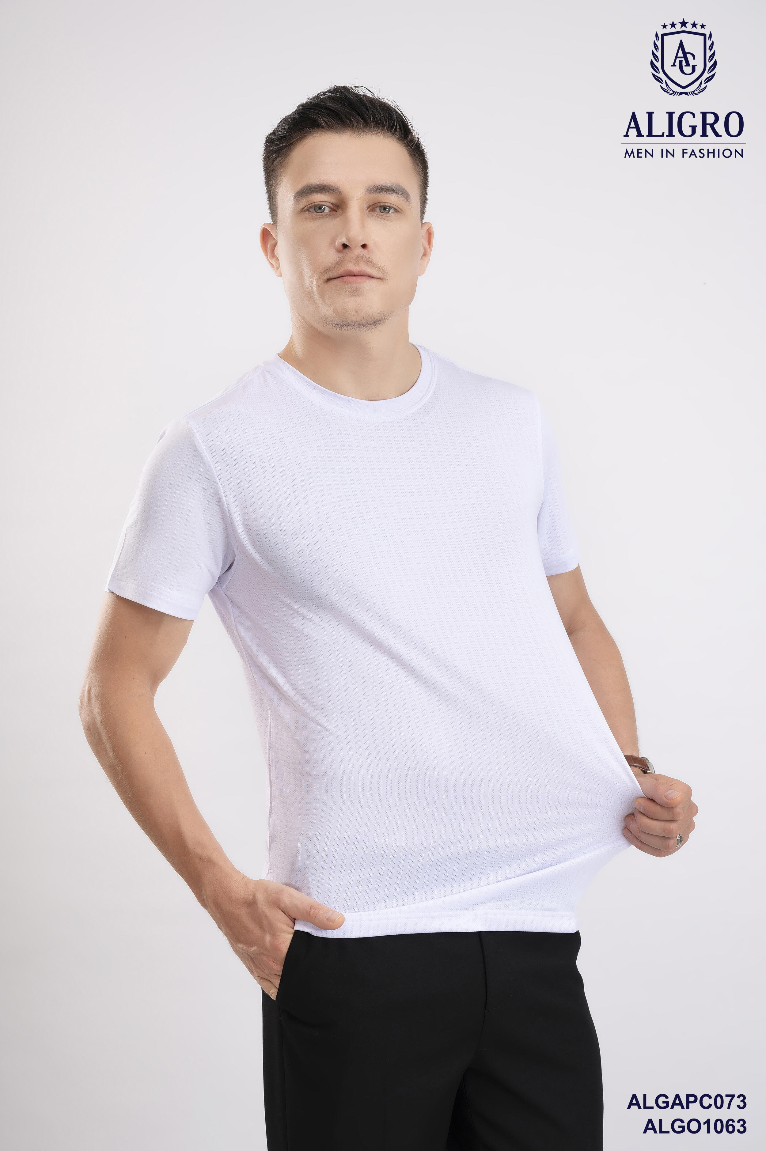Áo thun nam cổ tròn ngắn tay cao cấp Aligro ALGAPC073 chất liệu cotton form SLIMFIT ô chấm màu trắng