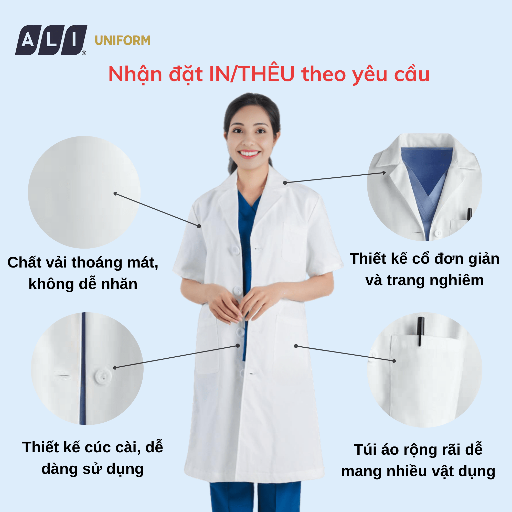 - Thiết kế: Áo blouse trắng dáng suông, mang đến sự thoải mái và chuyên nghiệp cho nhân viên y tế. Thiết kế gồm hai túi sườn tiện dụng và một túi ngực để cài bút hoặc thẻ tên.