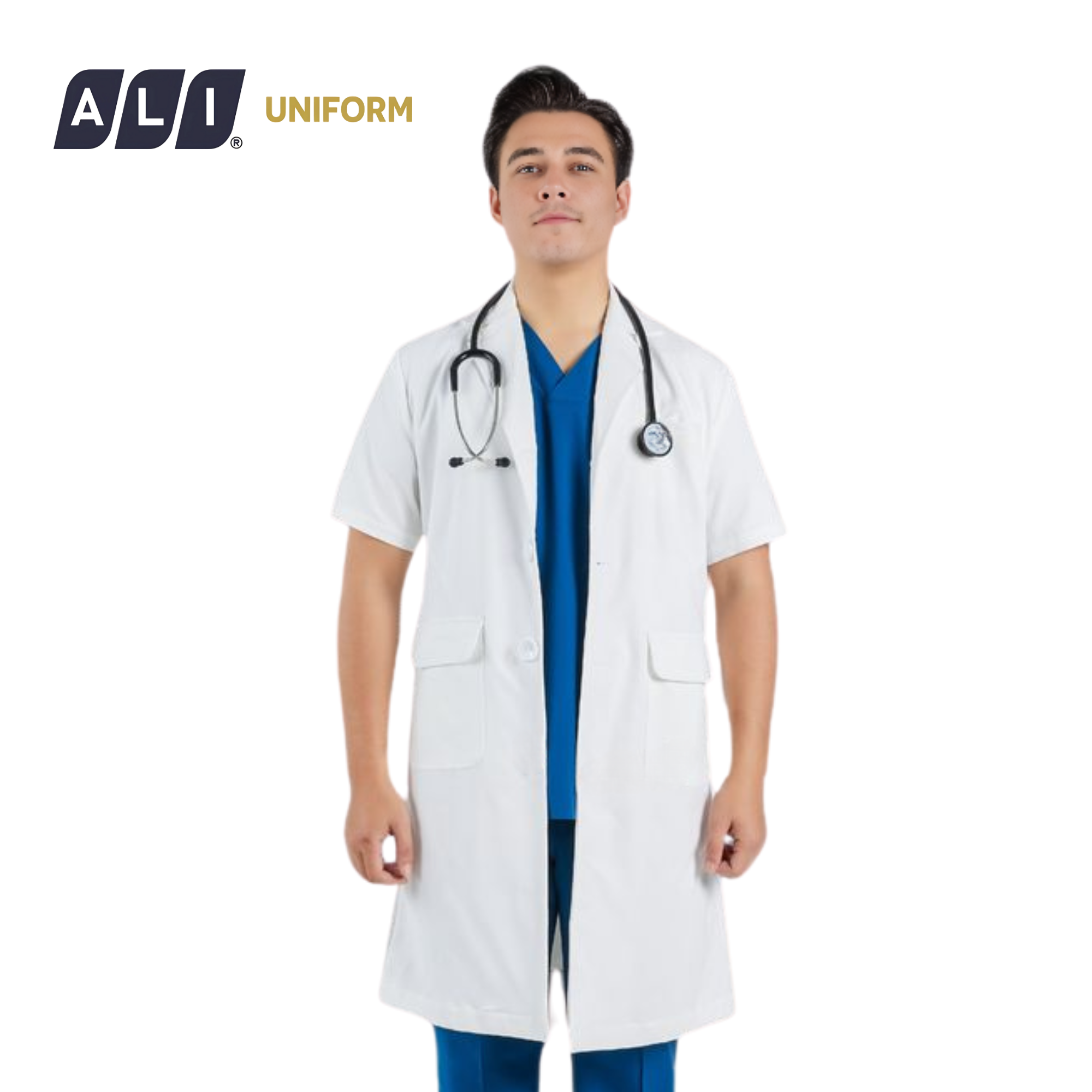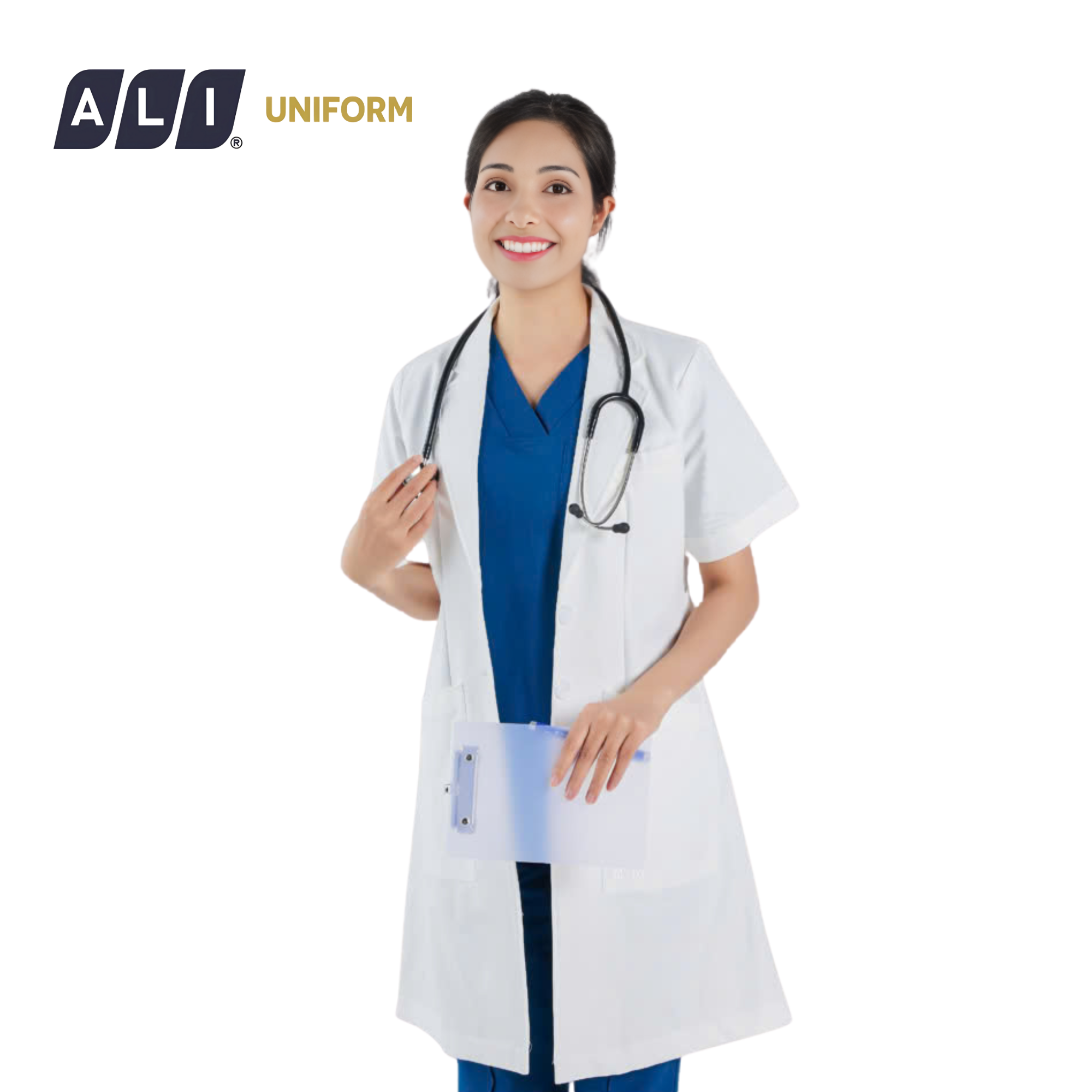 Áo choàng blouse, áo blue trắng cộc tay, dáng dài, chất vải kaki chun hàn cho bác sĩ, dược sĩ, spa Aligro BV.CA.ABLU.KKC