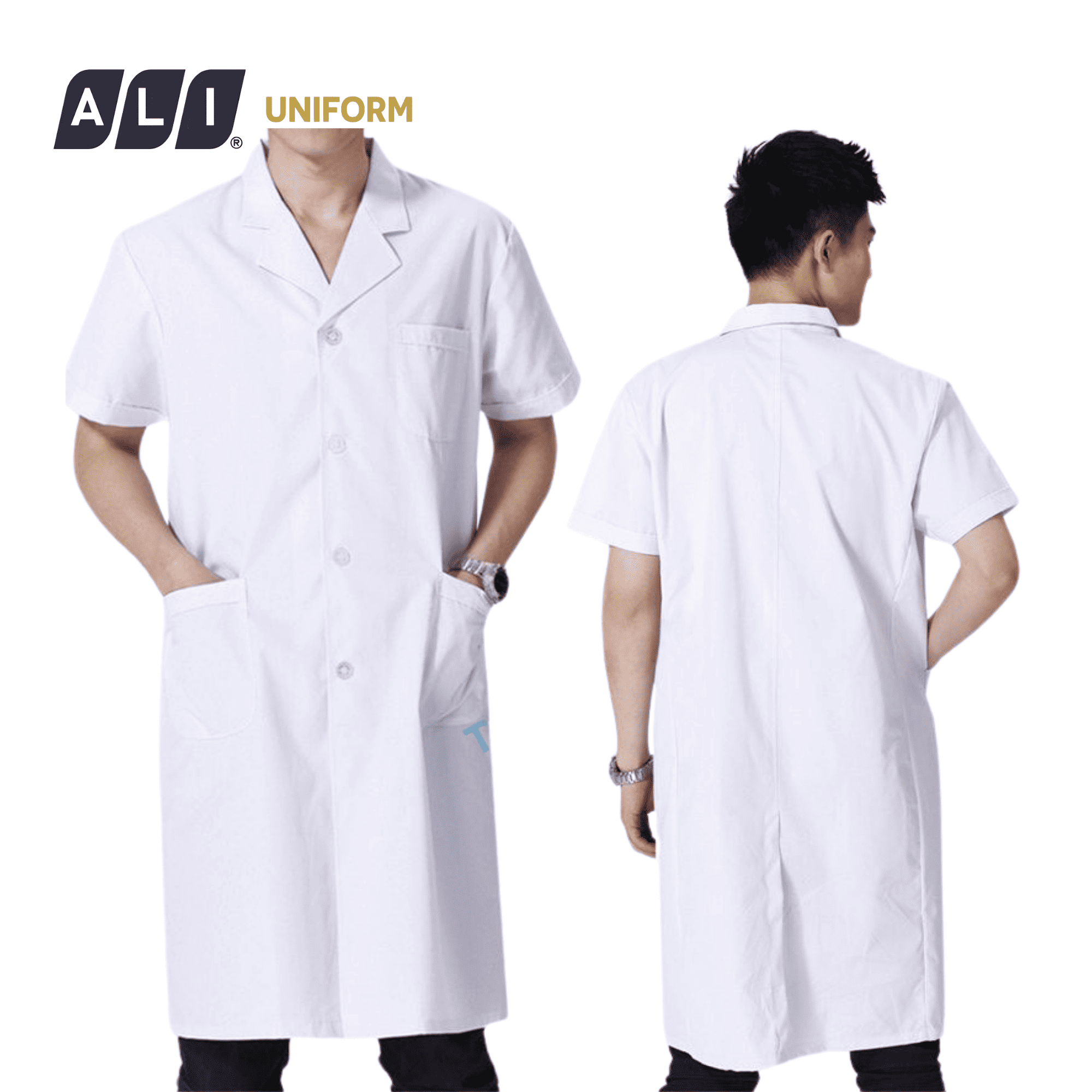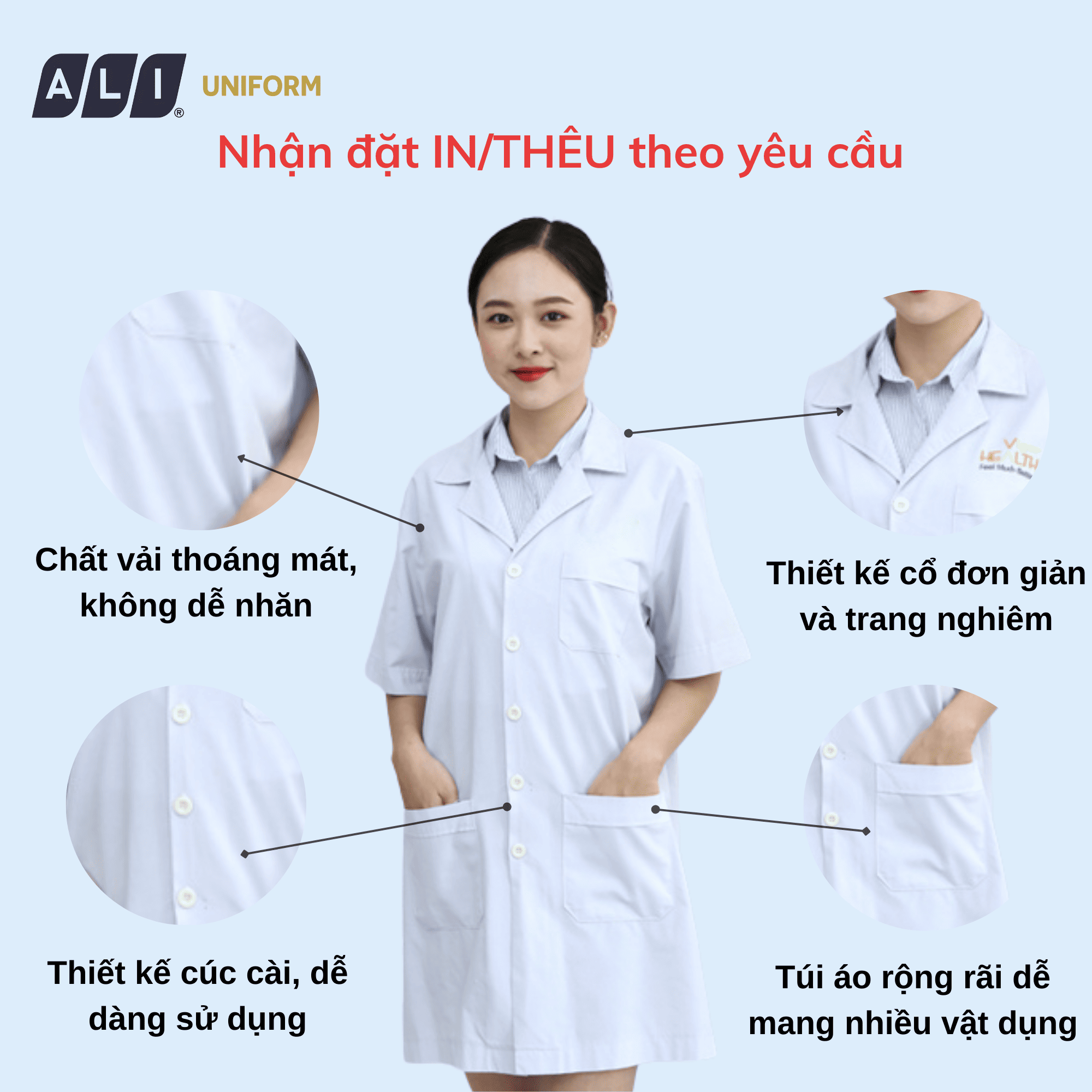 - Thiết kế: Áo blouse trắng dáng suông, mang đến sự thoải mái và chuyên nghiệp cho nhân viên y tế. Thiết kế gồm hai túi sườn tiện dụng và một túi ngực để cài bút hoặc thẻ tên.