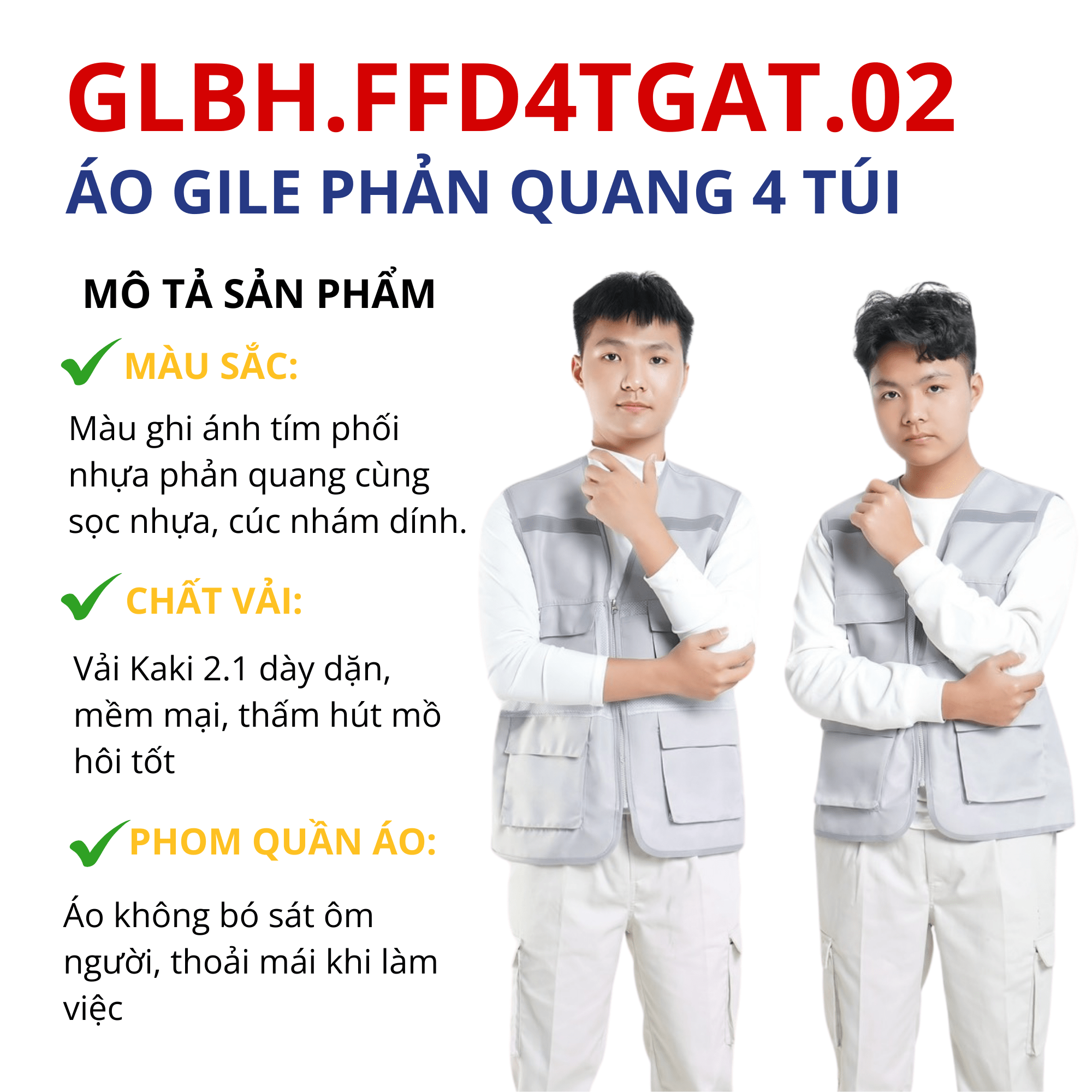 Áo gile bảo hộ lao động phản quang 4 túi chất vải kaki hoặc lưới thoáng mát, thấm hút tốt màu GHI ÁNH TÍM GLBH.FFD4TGAT.02 là áo bảo hộ lao động được thiết kế dành riêng cho công nhân, kỹ sư, mang đến sự thoải mái và an toàn tối đa trong quá trình làm việc. Sản phẩm được may từ vải kaki hoặc vải lưới thoáng mát, trước và sau may thêm sợi phản quang màu ghi phù hợp với công nhân làm việc trong môi trường có ánh sáng yếu.