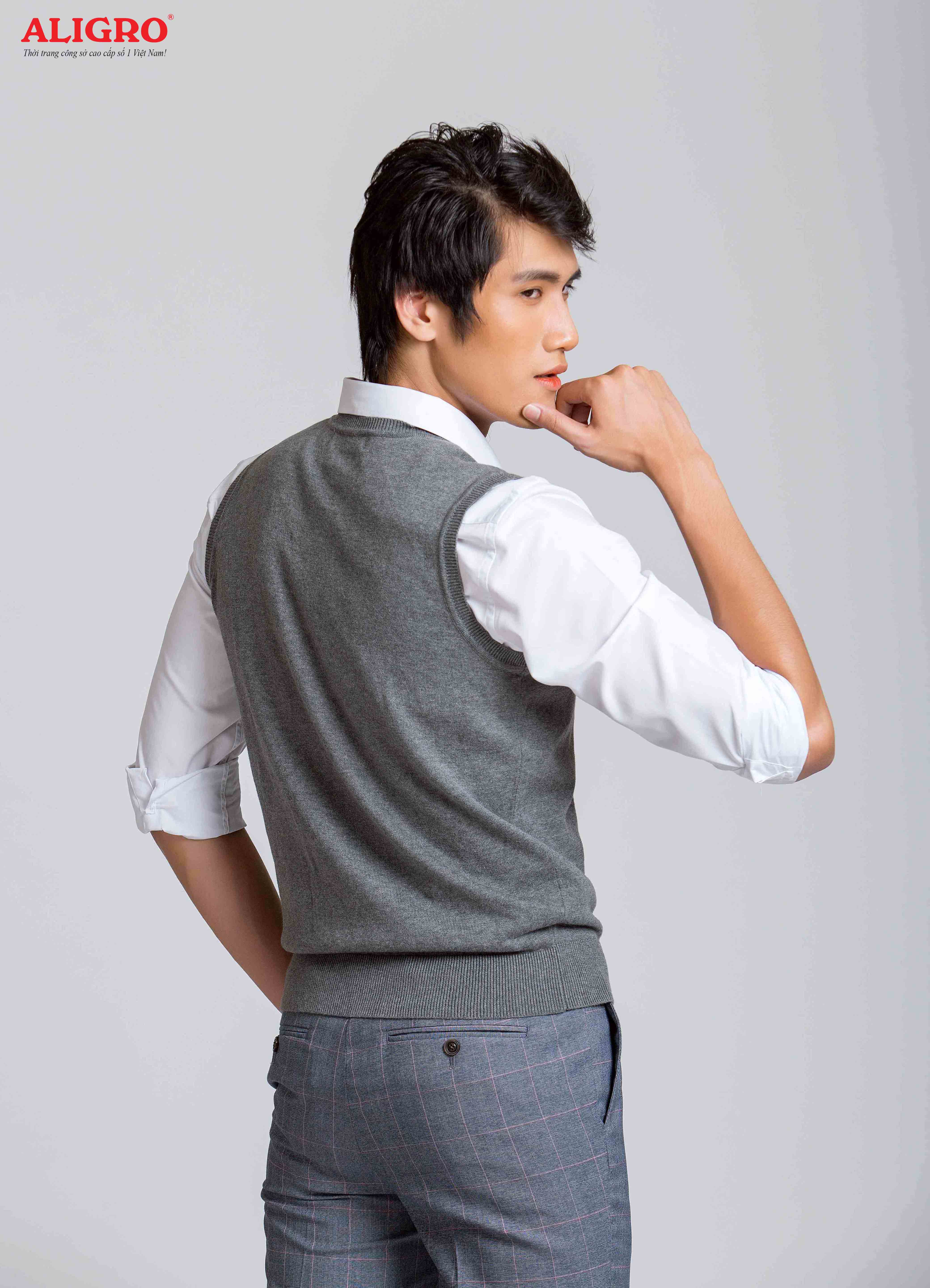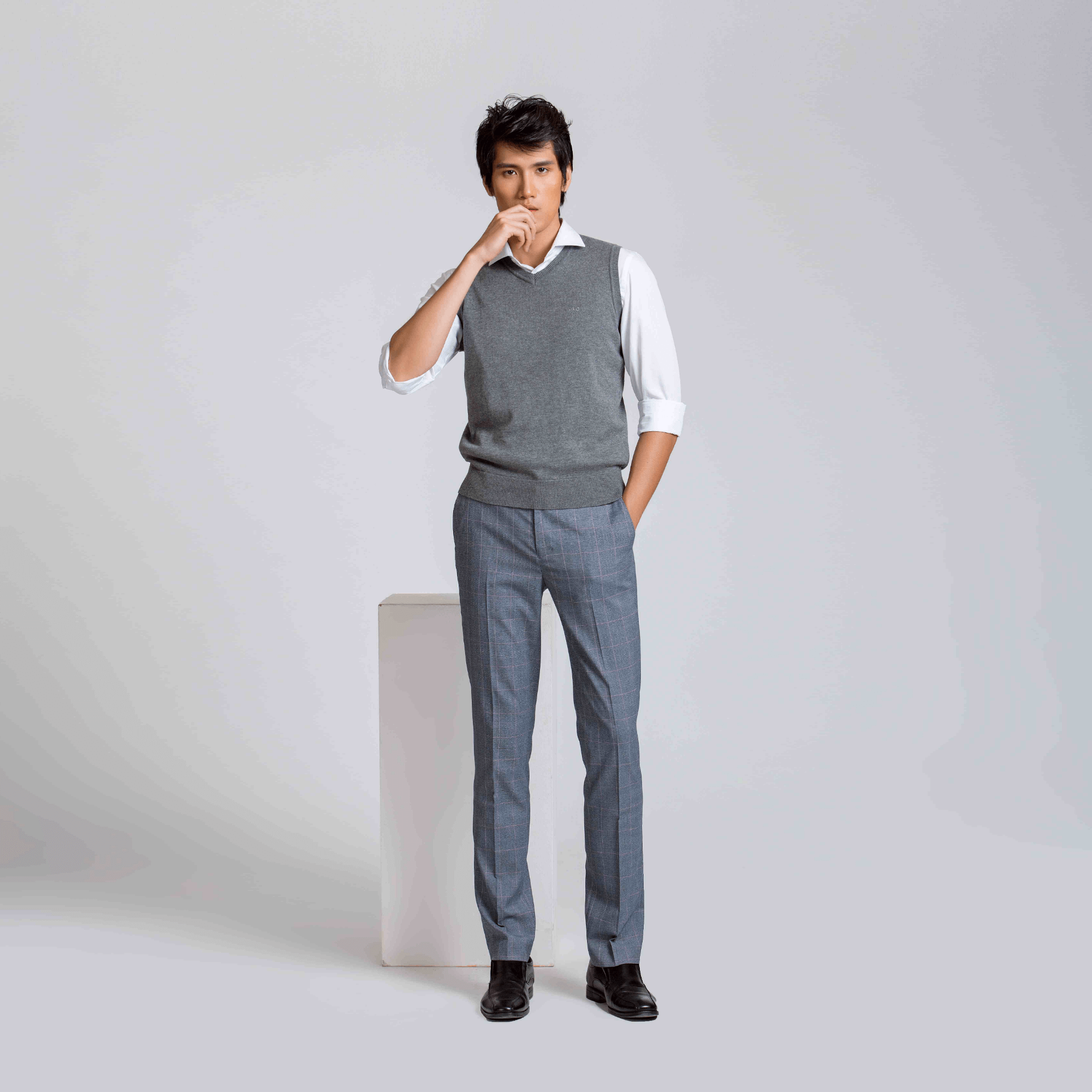 - Áo gilê len cổ tim kết hợp với áo sơ mi dài tay và áo khoác là một sự lựa chọn thú vị cho nam giới trong mùa thu đông này.