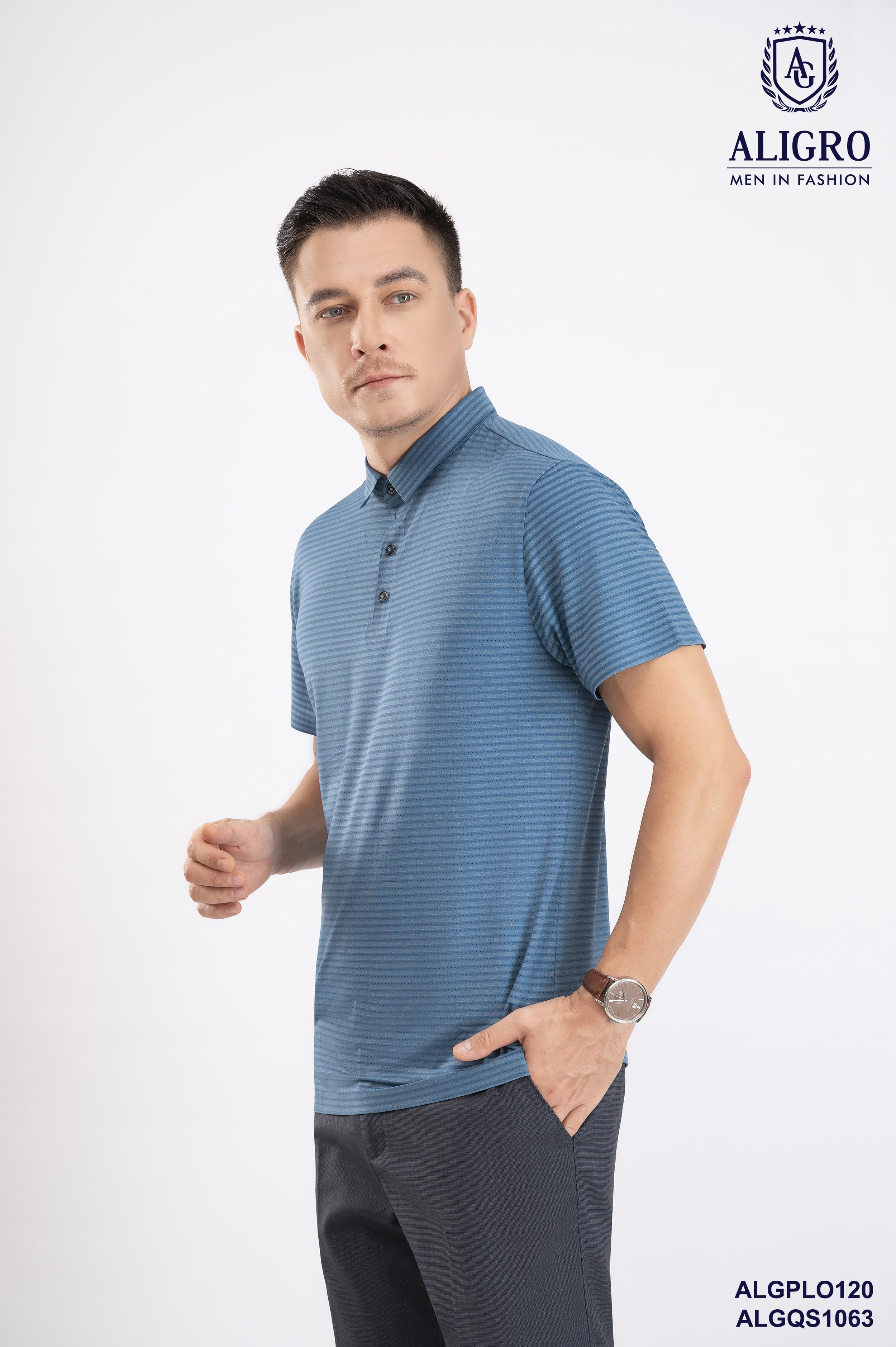 Áo Polo golf cao cấp Aligro ALGPLO120 công nghệ Seamless - không đường may form SLIMFIT xanh navydệt kẻ ngang