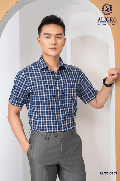 Áo sơ mi nam ngắn tay cao cấp Aligro ALGS-C109 chất liệu vải bamboo form SLIMFIT kẻ ô vuông