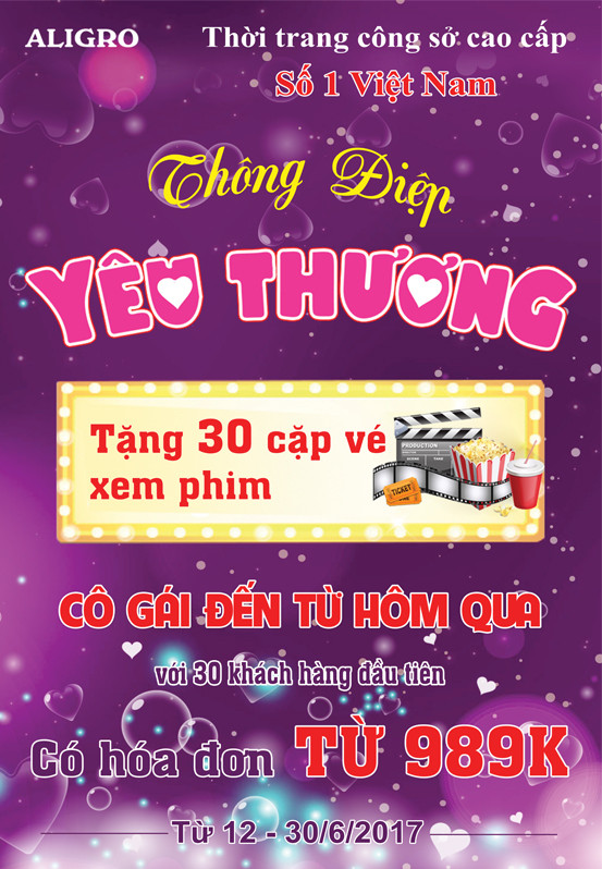 - Tặng ngay 30 cặp vé xem phim Hot nhất trong tháng 07-2017 cho 30 cặp đôi đầu tiên để hâm nóng tình cảm đôi lứa. Bộ phim " CÔ GÁI ĐẾN TỪ HÔM QUA " với đơn hàng từ 989K trở lên.