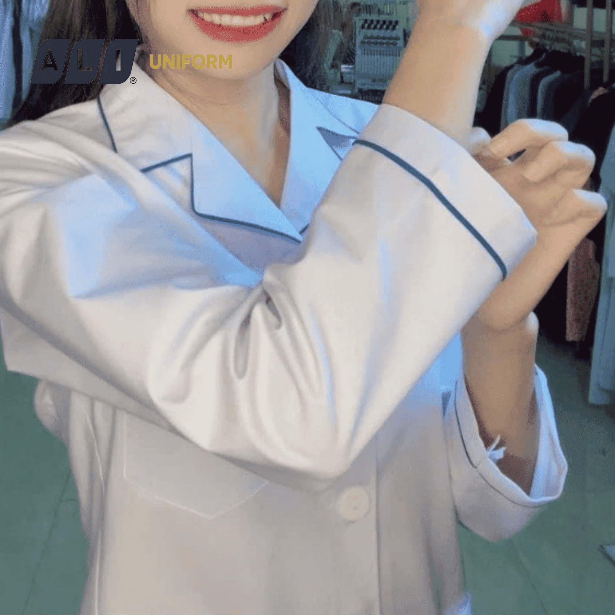 Áo điều dưỡng, áo blue trắng dài tay, có lé chất vải kaki chun hàn cho bác sĩ, dược sĩ, spa Aligro BV.CA.ADD.KK.DNU.2