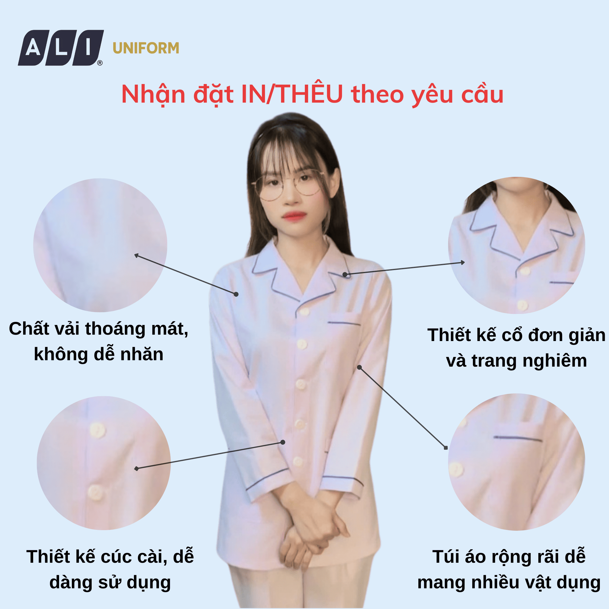 - Thiết kế: Áo được thiết kế với cổ bẻ có đường kẻ lé, hai túi sườn tiện lợi, với túi áo cài thẻ tên trang trọng trước ngực và tay áo dài.